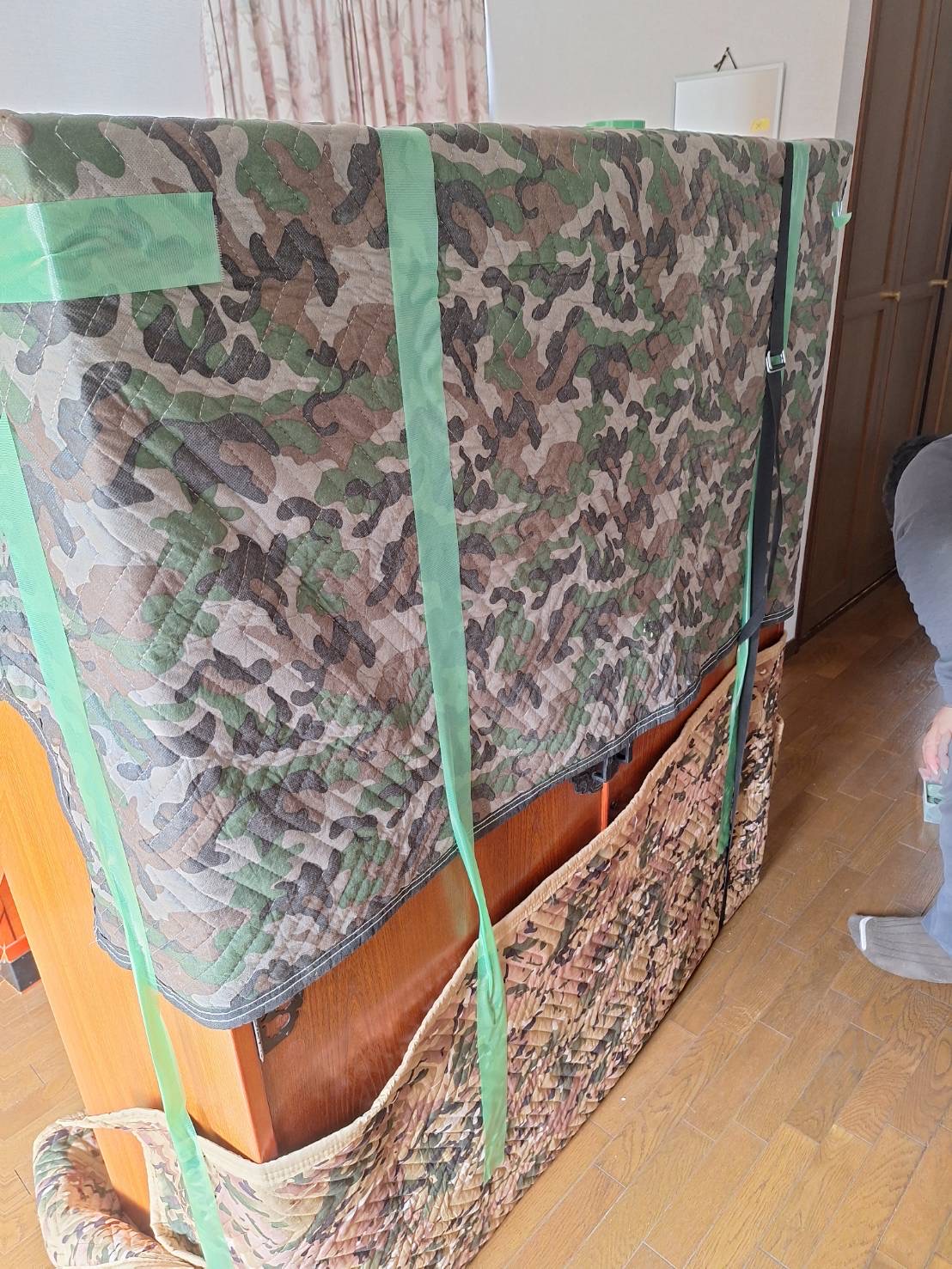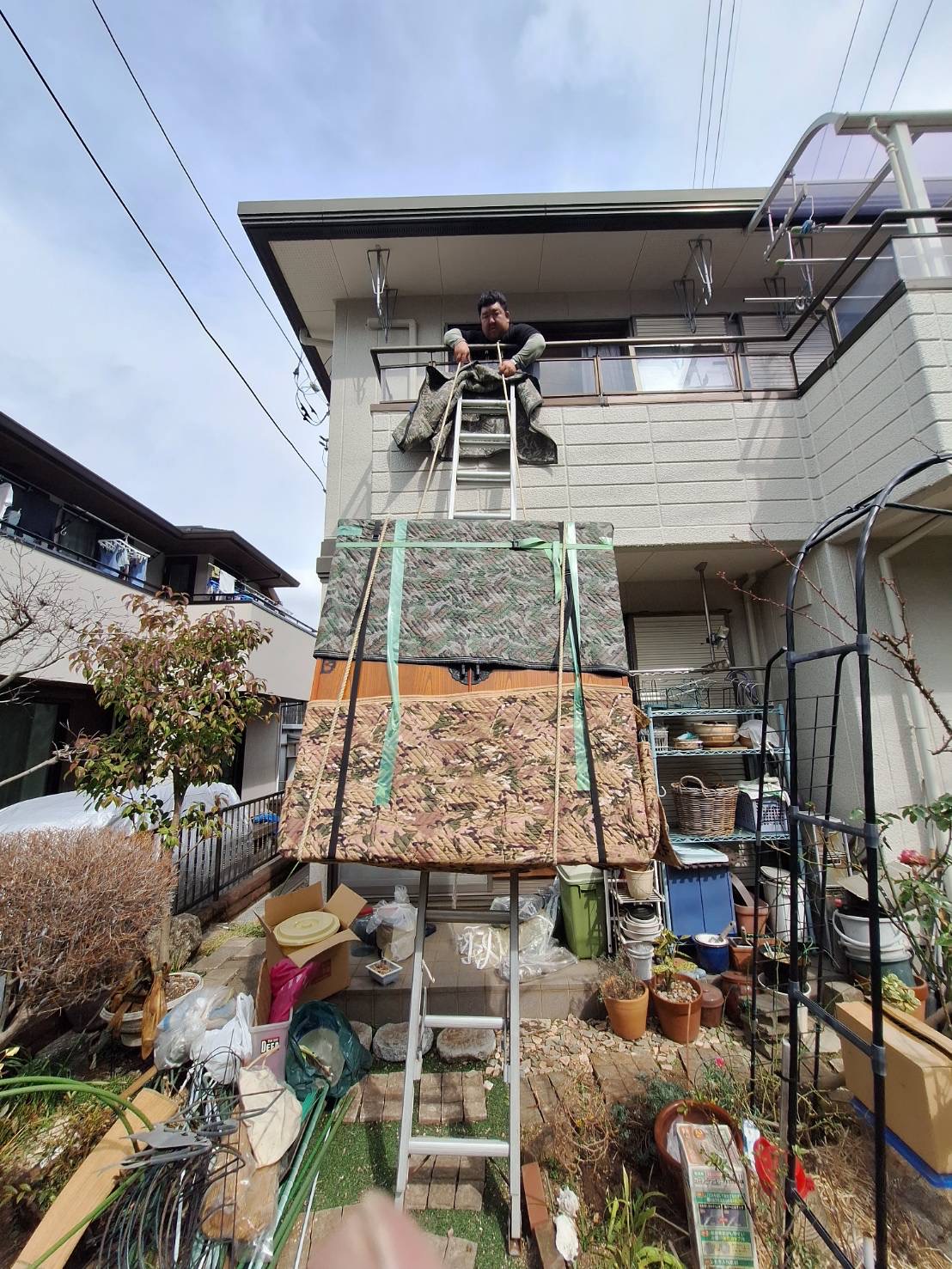 階段から降りないので、外から吊り降ろしました! 2人、高所作業の料金です。